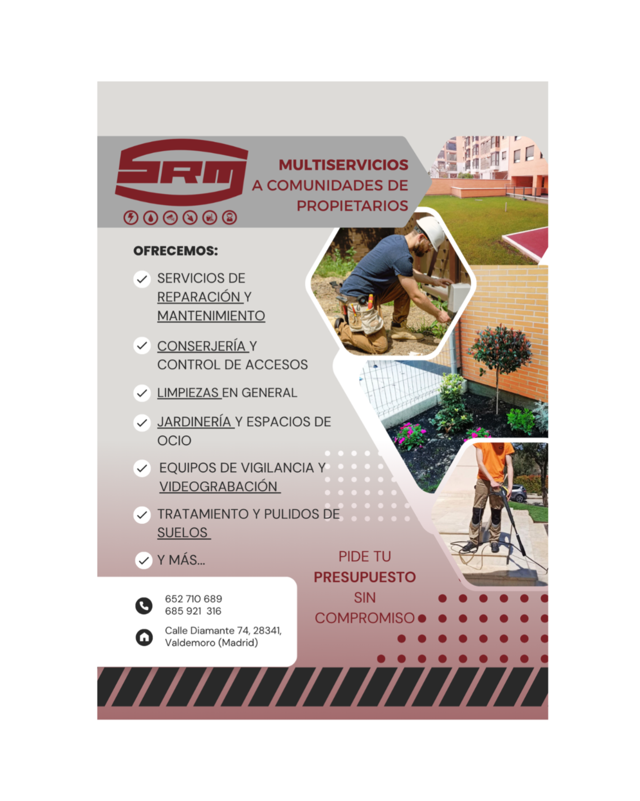 En SRM Multiservicios, nos especializamos en simplificar el mantenimiento de comunidades de vecinos, ofreciendo una gestión eficiente y sin complicaciones. Nuestro compromiso es proporcionar servicios adicionales diseñados para garantizar su bienestar y tranquilidad. Con un enfoque en la administración óptima de las comunidades, trabajamos para liberar a nuestros clientes de preocupaciones y contribuir a mejorar su calidad de vida.