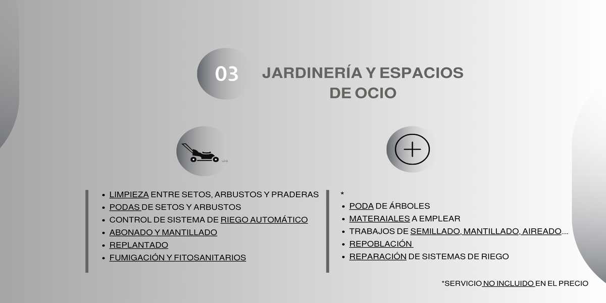 Entre nuestros servicios se incluyen el mantenimiento de jardines, cuidado de praderas, repoblación y mantillado. En resumen, ofrecemos todo lo necesario para mantener en perfecto estado las áreas verdes de su comunidad.